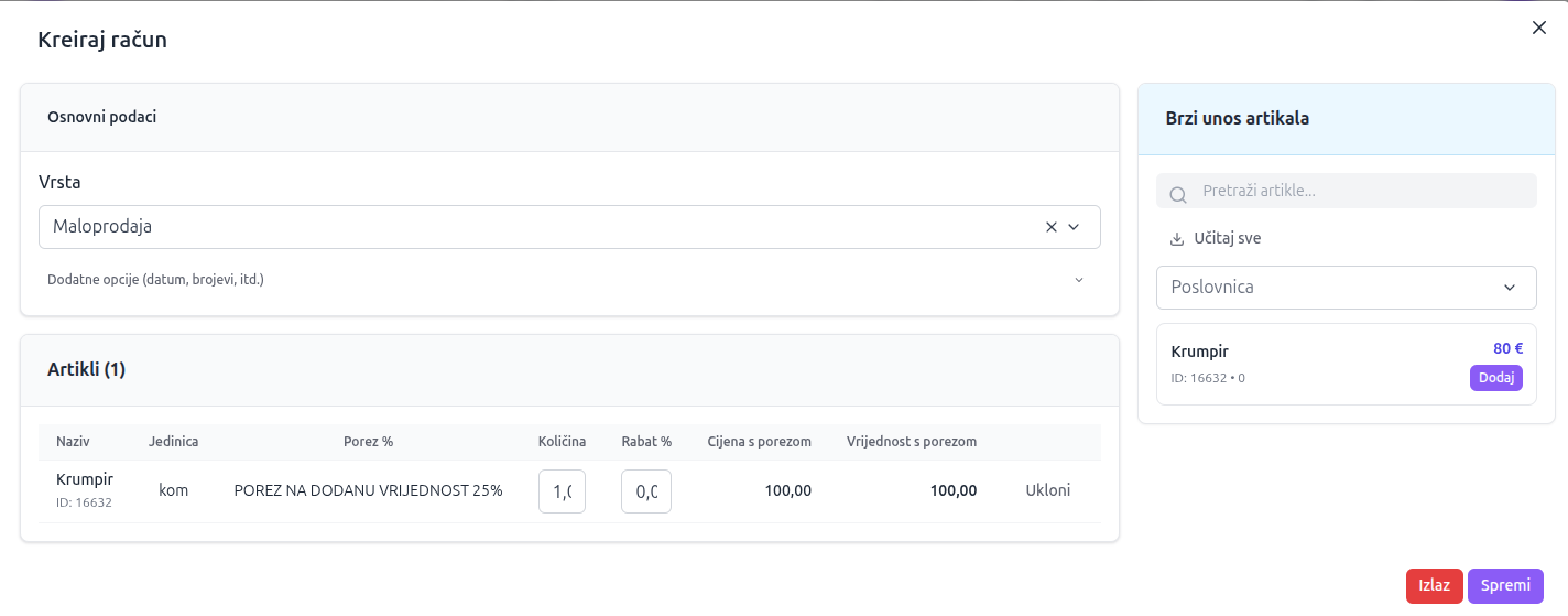 Upravljanje katalogom proizvoda i usluga. Cijene, PDV stope, šifre, zalihe po poslovnicama.